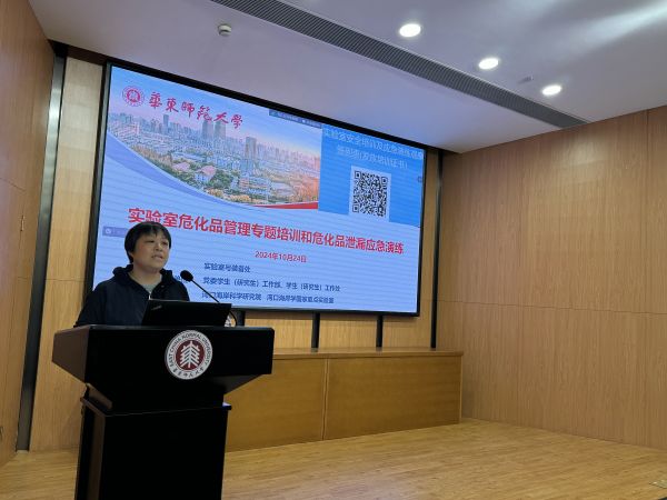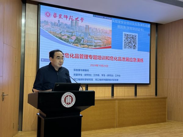 为进一步提升师生对实验室危化品安全管理的认识,增强应对化学品泄露等突发事件的应急处置能力,10月24日下午,河口海岸科学研究院与河口海岸学国家重点实验室、实验室与装备处、党委学生(研究生)工作部、党委学生(研究生)工作处在河口海岸大楼联合开展实验室危化品管理专题培训和危化品泄漏应急演练。河口海岸科学研究院与河口海岸学国家重点实验室党委书记嵇渭萍、实验室安全管理办公室副主任兼实验室与装备处副处长李茂田、学生(研究生)工作处副处长江宇靖、各二级单位安全员、师生近100人参加活动,活动由河口海岸学国家重点实验室副主任江红主持。