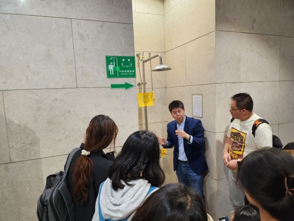 随后进行了盐酸泄露的现场应急演练。演练现场设置在河口海岸大楼一楼某实验室,根据实验室化学品使用情况及实验室真实环境模拟突发实验室安全事件。整场演练按照现场伤情处置、受伤人员互救、人员疏散、现场警戒封锁、逐级事故上报、应急救援人员个人防护穿戴、排查消除危险源、洗消除污、现场恢复等应急处置流程开展。各环节安排紧凑,有序进行。整个演练过程全程直播,配合专家实时解说,让师生通过现场沉浸式的观摩体验,真切感受到演练对于现场正确处置的重要性,有效提升了师生的实验室安全意识。活动最后,屈文军还带领师生进行了实验室应急喷淋和洗眼设备使用讲解。