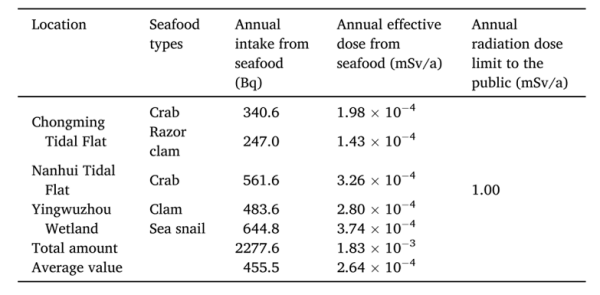 2023年5月,在长江河口崇明、南汇和瀛鹉洲潮滩采集了海水、沉积物和代表性生物样品。发现海水¹⁴C活度浓度与国际其他海域相当;沉积物和生物体(蟹、缢蛏、文蛤、海螺等)¹⁴C活度浓度均处于正常环境范围。海水和沉积物中¹⁴C活性呈现崇明潮滩 > 南汇潮滩 > 瀛鹉洲湿地的趋势。生物体内¹⁴C浓度则受食性影响,杂食性蟹类浓度通常高于滤食性贝类。基于居民海鲜消费量估算,摄入该区域海产品所致的¹⁴C年有效剂量为1.43–3.74 × 10⁻⁴ mSv,远低于我国公众照射剂量限值(1 mSv)和全球天然本底辐射水平,当前条件下不构成显著的放射健康风险。
