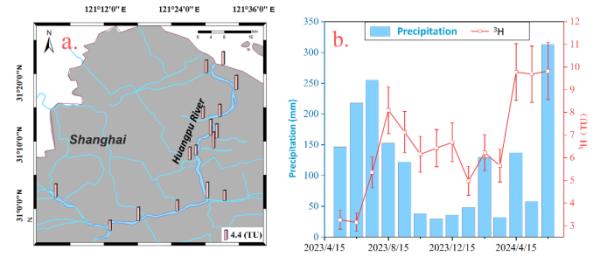 图2 上海主要河流的3H活度分布(a.)和上海降水(mm)和3H活度浓度(TU)的时间变化(单次测量)(b.)