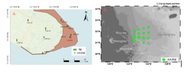图3 崇明岛(a.)和长江口的3H活度(TU)分布(b.)