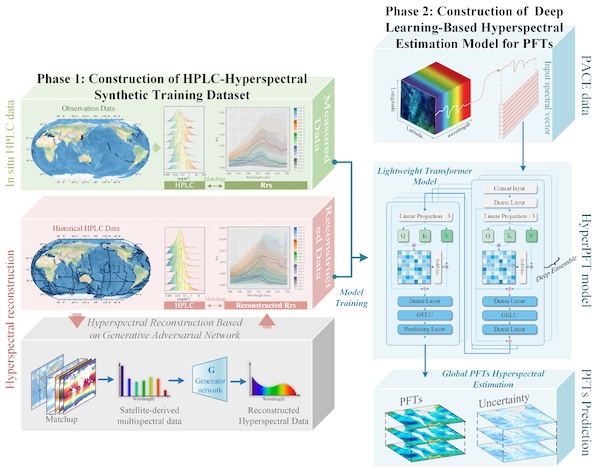 精准识别和监测PFTs的组成与分布,对于海洋碳汇核算、海洋健康评估、预警有害藻华以及指导渔业管理等方面具有重要意义。2024年,NASA成功发射PACE卫星,其搭载的海洋水色高光谱传感器(Ocean Color Instrument, OCI)为PFTs的精细监测带来了前所未有的机遇。然而,实现全球尺度下的PFTs高光谱反演应用仍面临两方面挑战:一是缺乏大规模、高质量的同步观测数据支撑模型构建;二是传统反演方法难以适用于高光谱数据,亟需发展新型反演模型。