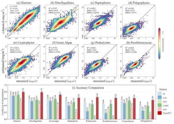 结果表明,HyperPFT模型在8种浮游植物类群(Diatoms, Dinoflagellates, Haptophytes, Pelagophytes, Cryptophytes, Green Algae, Prokaryotes, and Prochlorococcus)的预测任务中表现稳健,在与其他机器学习算法的对比中显著领先,展现出更强的精度与泛化能力(图3)。