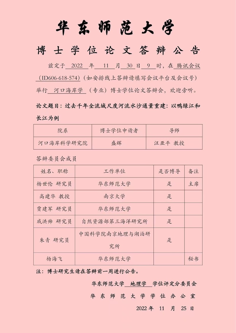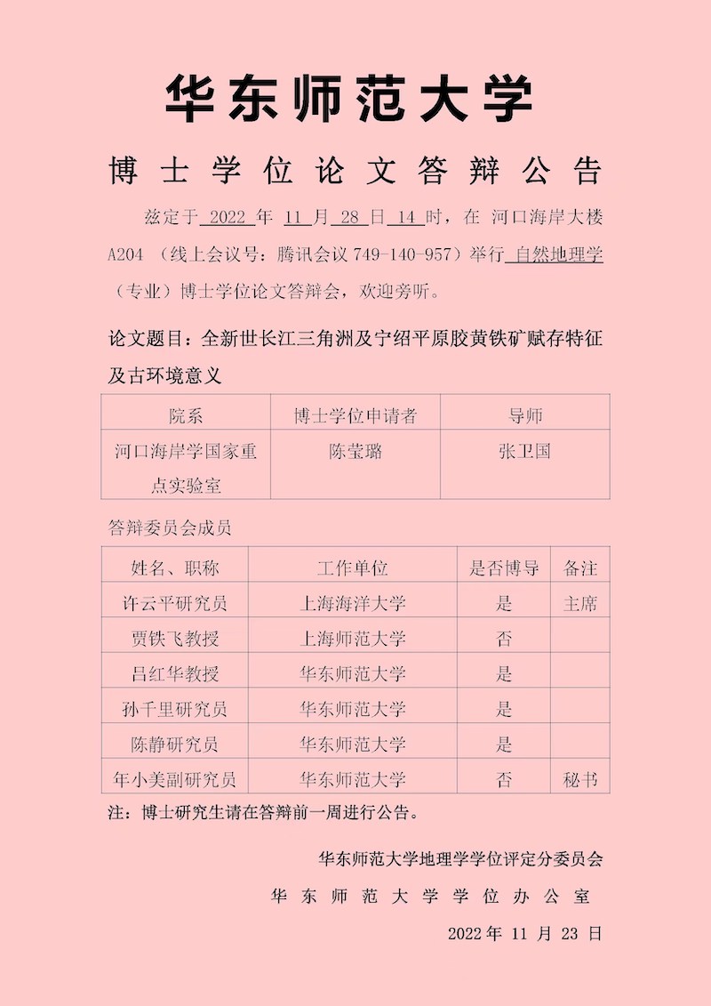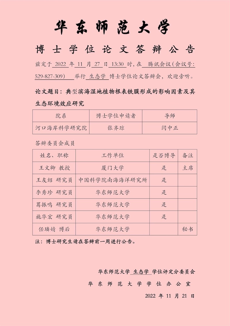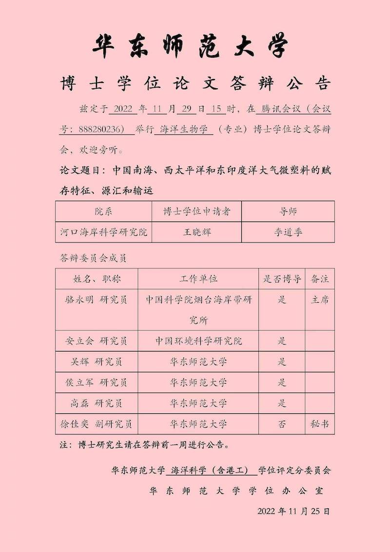 博士学位论文答辩公告-王晓辉(海洋生物学,导师李道季)
