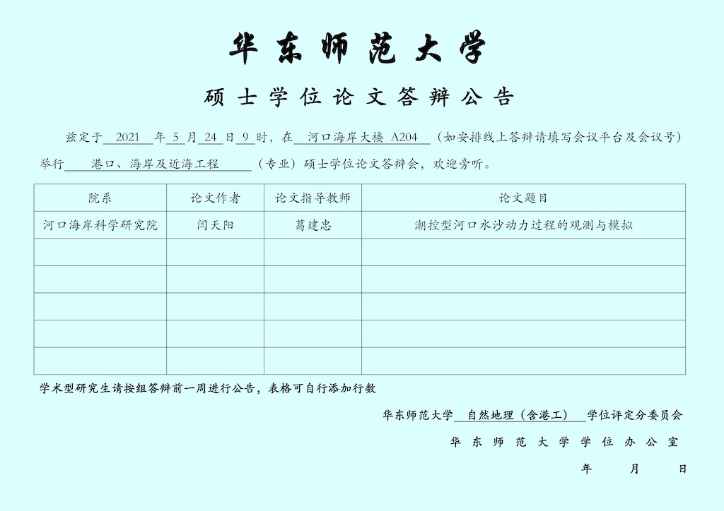 2020年6月8日上午,华东师范大学河口海岸科学研究院、河口海岸学国家重点实验室2021届研究生毕业典礼暨学位授予仪式在河口海岸大楼B101报告厅举行。院、室2021年春季和秋季共有65位同学申请学位,其中获得硕士学位47人,博士学位18人。河口海岸科学研究院和河口海岸科学学国家重点实验室党委书记俞世恩、副书记童春富,河口海岸科学研究院院长、河口海岸学国家重点实验室主任何青,河口海岸科学研究院副院长、河口海岸学国家重点实验室副主任侯立军,以及院、室相关教师代表,共同见证了河口海岸学子完成学业、开启人生新篇章的重要时刻。毕业典礼由童春富副书记主持。